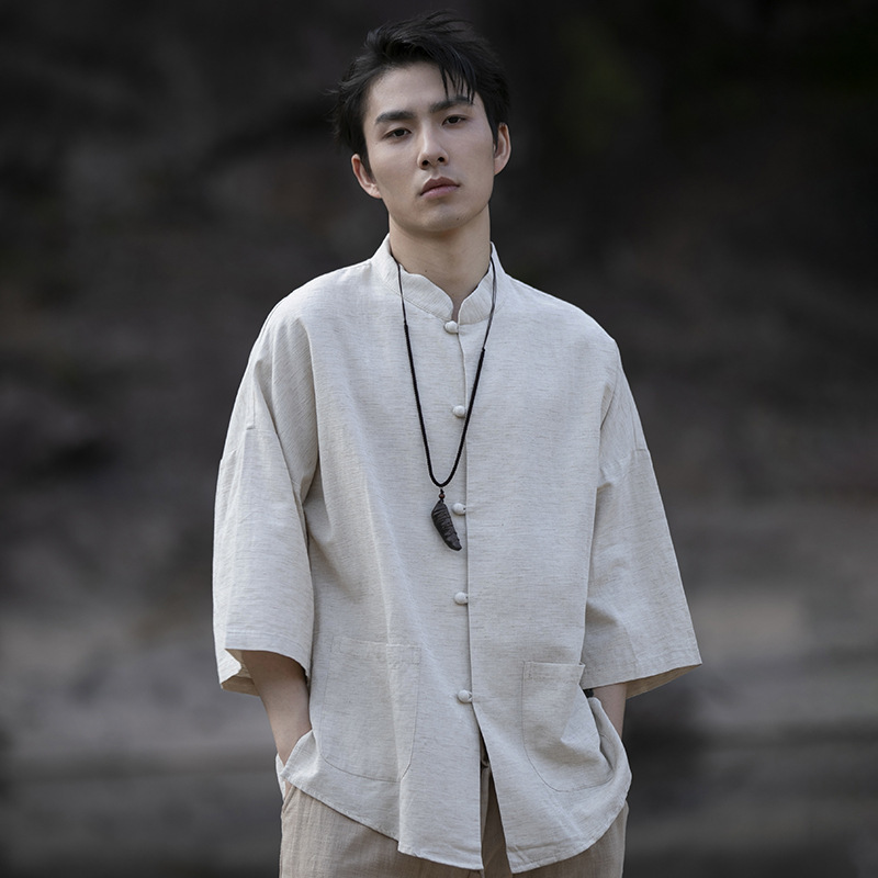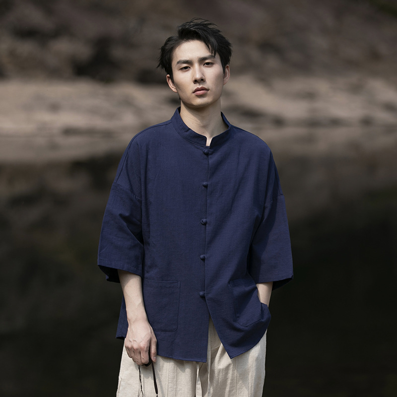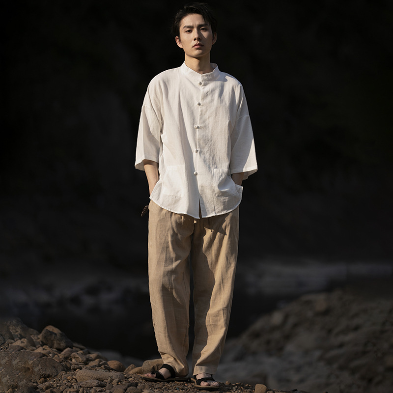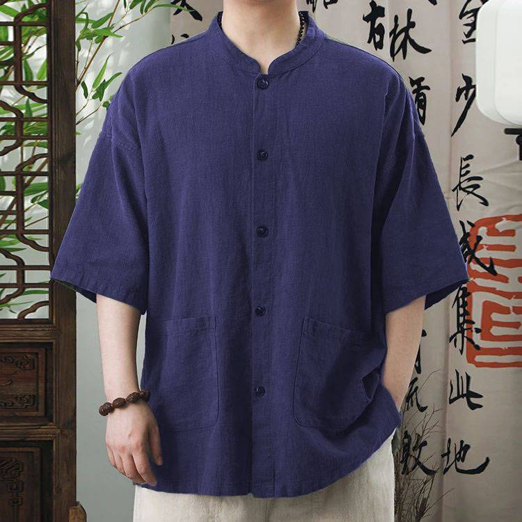 男士夏季寬鬆大碼棉麻立領五分袖