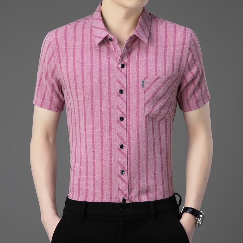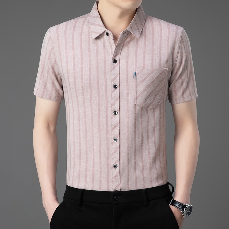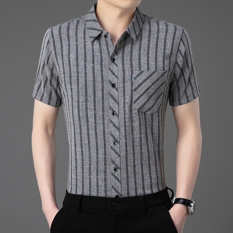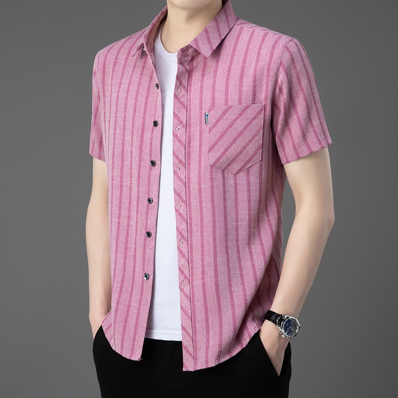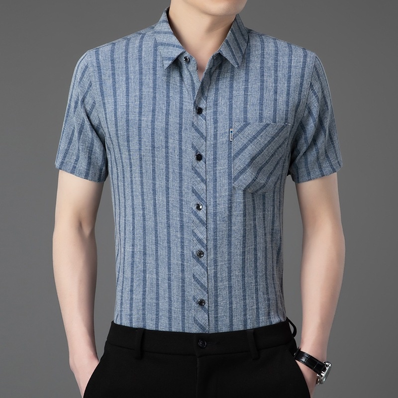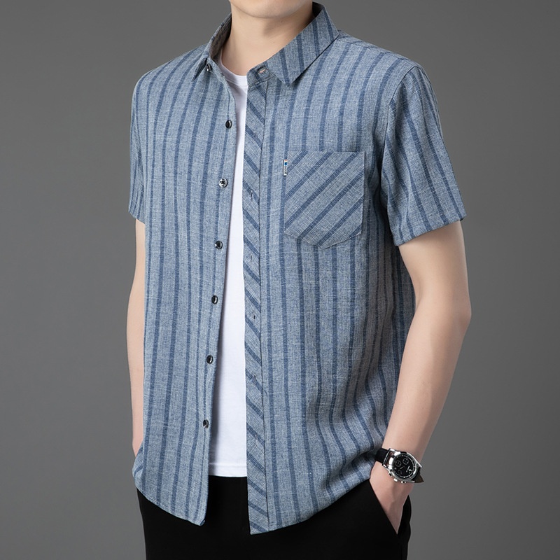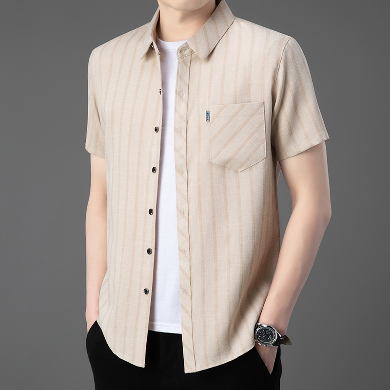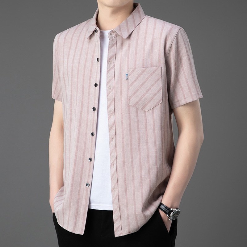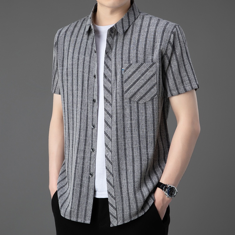 輕奢風,男士新款夏季條紋短袖,亞麻中青年條紋薄款,合體型真口袋翻領襯衫!