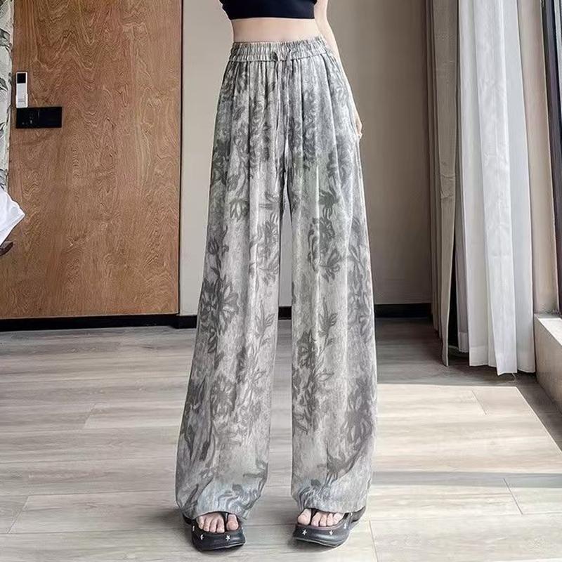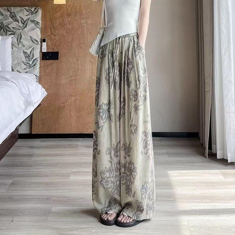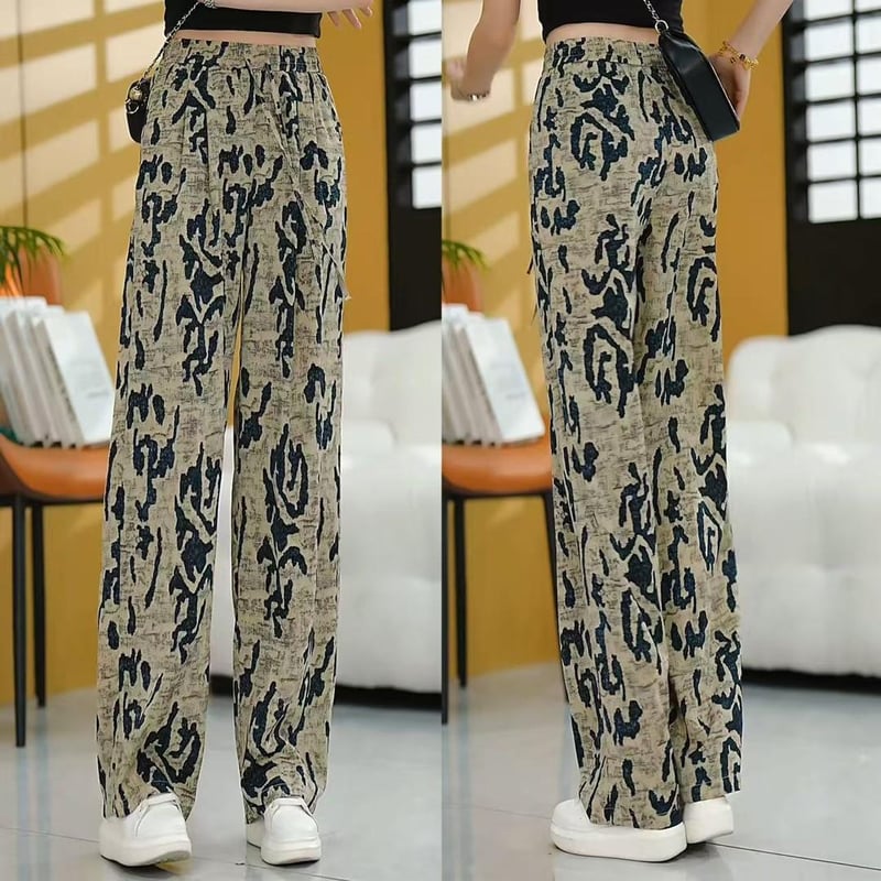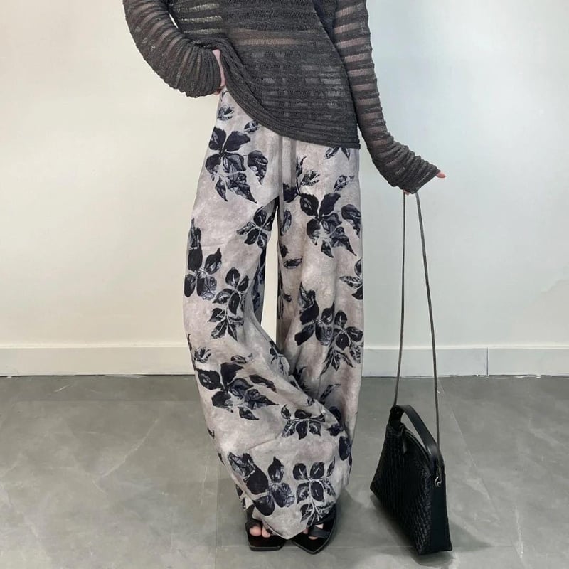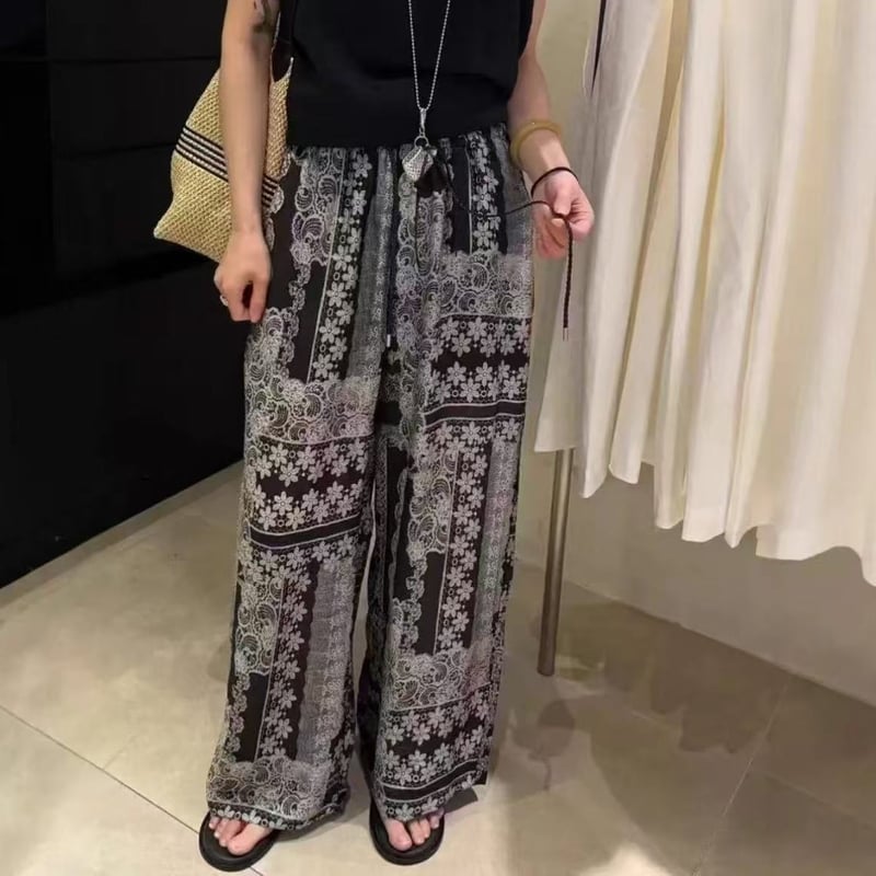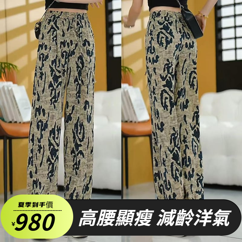 複古印花休閒褲 高腰線 闊腿褲型 輕鬆拉長腿部線條 小短腿秒變大長腿